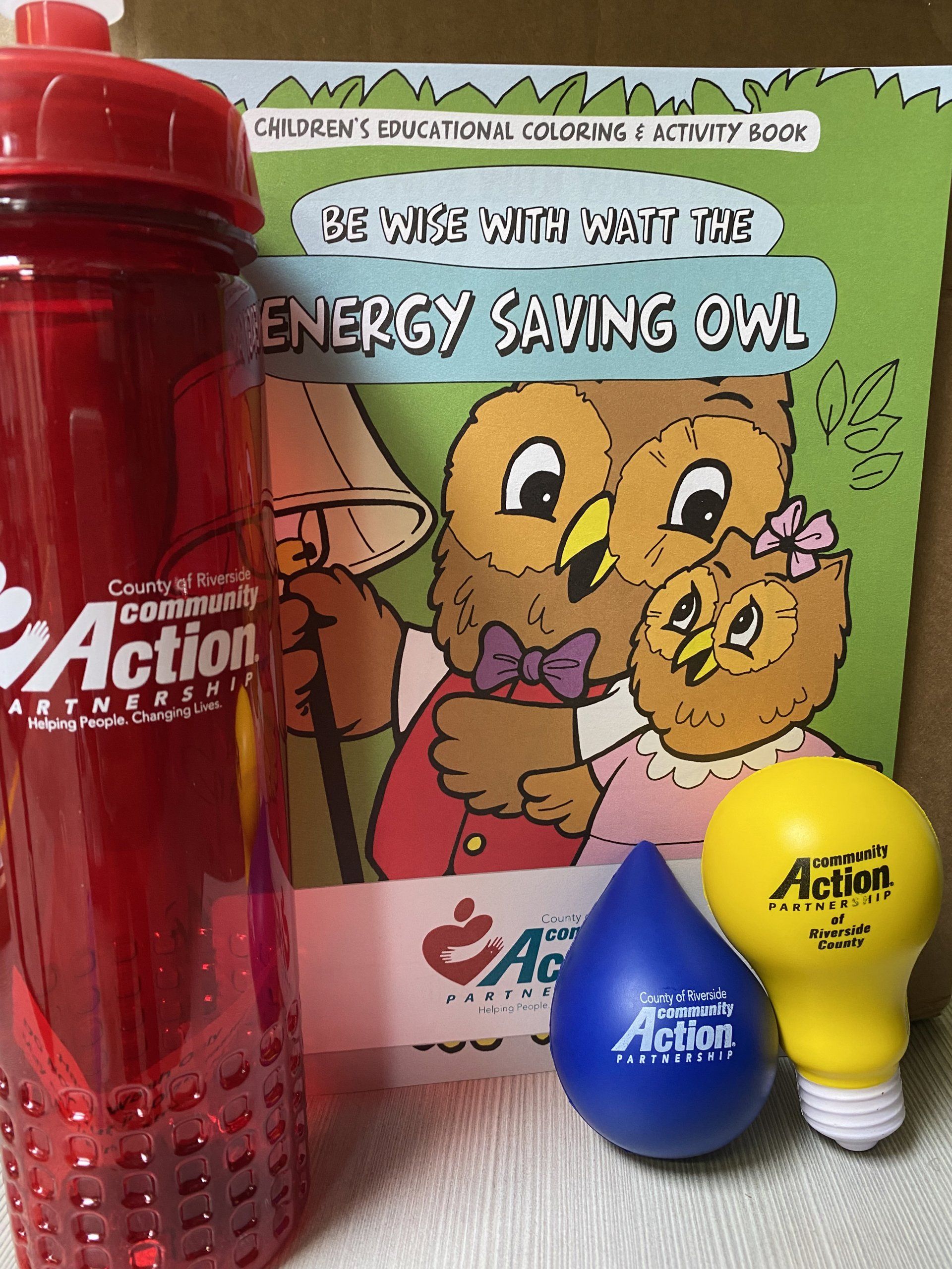 Attached is an image of the swag items we have ordered at CAP Riverside. The blue water drop stress “ball” was purchased for LIHWAP and of course the light bulb for LIHEAP. The coloring book does have the option to come individually wrapped with a small pack of crayons. In addition to these items, we also have mini first aid kits, and pens that double as a stylus. The vendor we use is Safeguard.