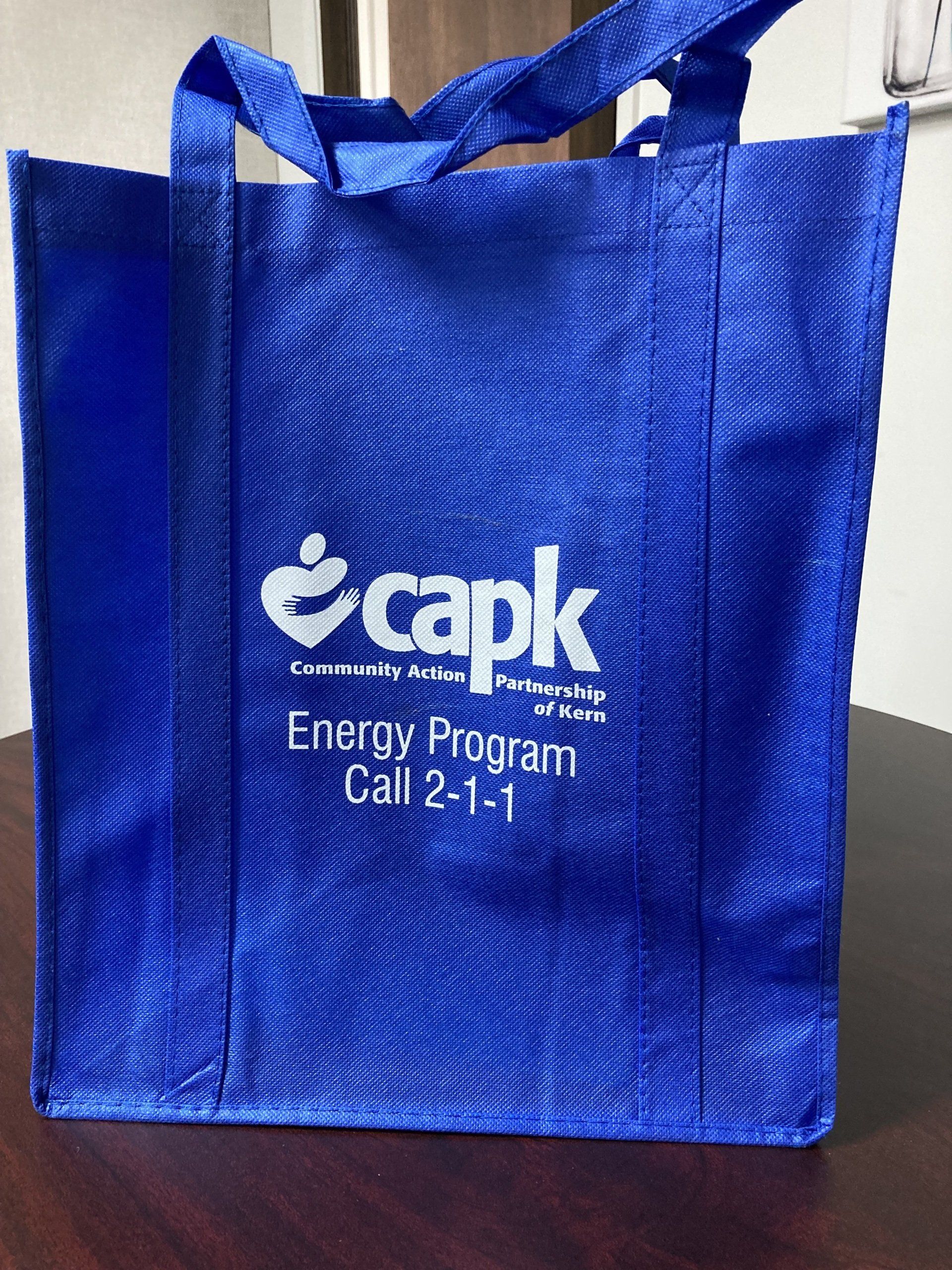 Reusable shopping back with agency name on front and 10 energy tips on back