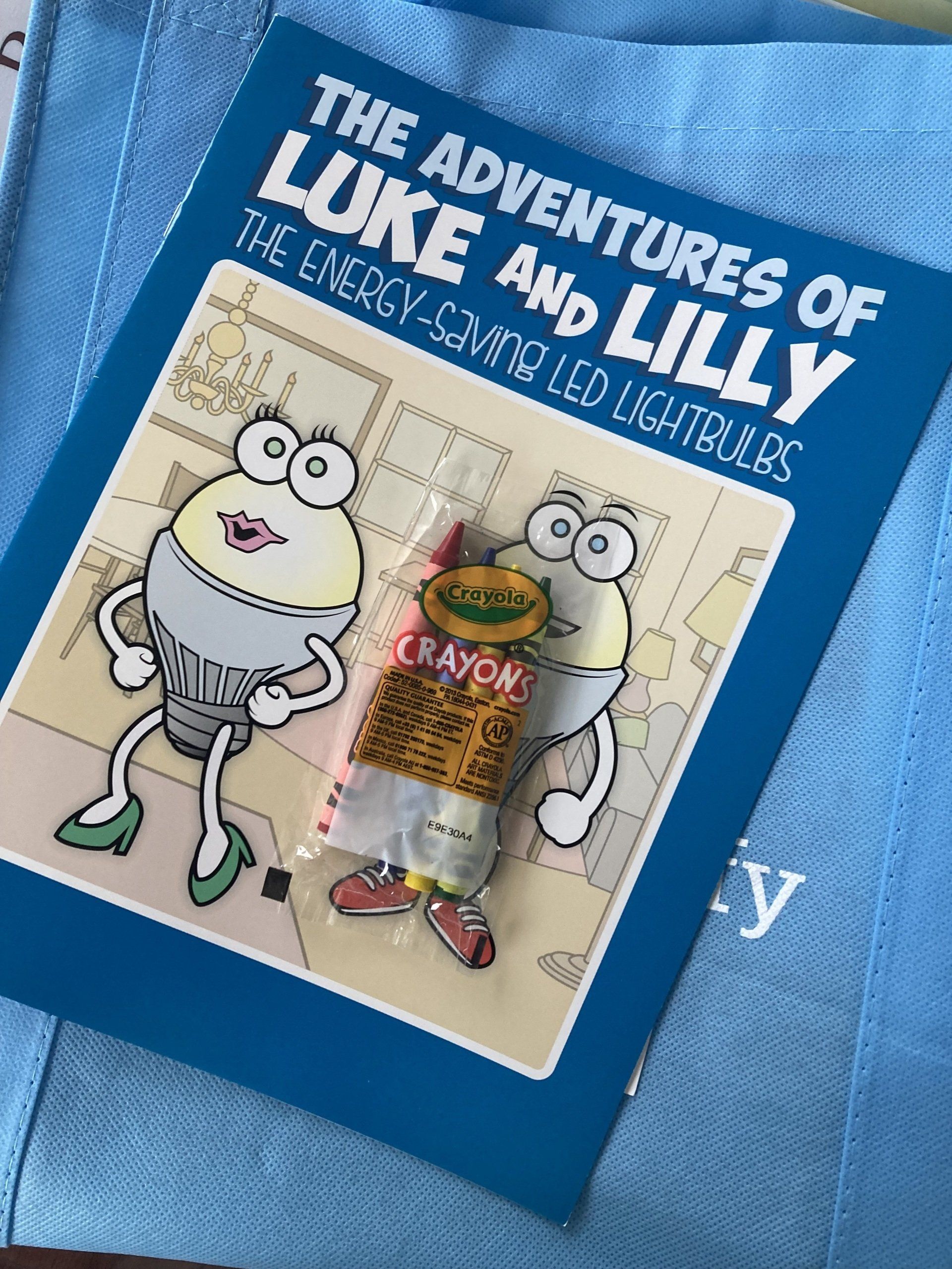 Alongside flyers and informational materials, we have a bunch of different branded things, including USB drives, pens, pencils, letter opener/ruler combo things, coffee mugs, water bottles, and the attached photos- canvas bags (which people like), cute children’s coloring books from the Energy Savers Project that do well with kids (and crayons to go with them), and water usage meters.